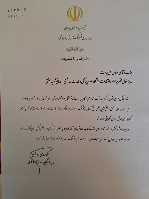 در مراسم آیین اهدای جوایز پدید آورندگان آثار شایسته تقدیر و تجلیل از ناشران آثار برگزیده چهل و یکمین جایزه کتاب سال جمهوری اسلامی، که با حضور وزیر محترم فرهنگ و ارشاد اسلامی و جمعی از اصحاب قلم و فرهنگ روز شنبه 16 تیرماه 1403 در تالار رودکی تهران برگزار شد، اداره انتشارات معاونت تحقیقات و فناوری دانشگاه علوم پزشکی شهید بهشتی موفق به کسب عنوان ناشر برگزیده چهل و یکمین جایزه کتاب سال جمهوری اسلامی گردید. دکتر عباس حق پرست مدیر مسئول انتشارات دانشگاه با حضور در این مراسم جایزه ویژه را از دست وزیر ارشاد و فرهنگ اسلامی دریافت نمود.